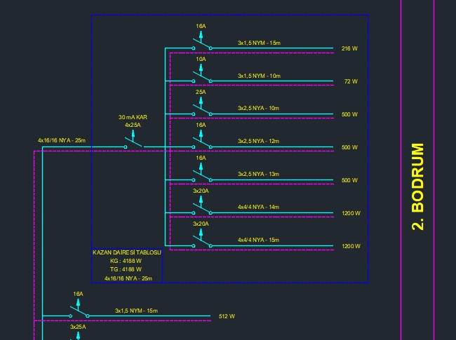 Kuvvetli akım ve zayıf akım elektrik tesisatları tasarlanarak ayrı paftalarda sunulur.